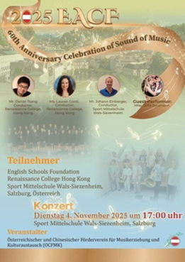 Ein besonderes Konzert stand am 4. November 2025 in der Sportmittelschule auf dem Programm: Für das European Academic und Culture Festival (EACF) besuchte eine Delegation des Renaissance College Hong Kong (eine Schule der English Schools Foundation ESF) die Sportmittelschule in Wals-Siezenheim - und gemeinsam mit Schülerinnen und Schüler unserer Schule gab es ein Jubiläumskonzert anlässlich von 60 Jahre "Sound of Music".